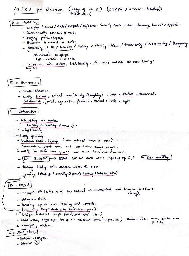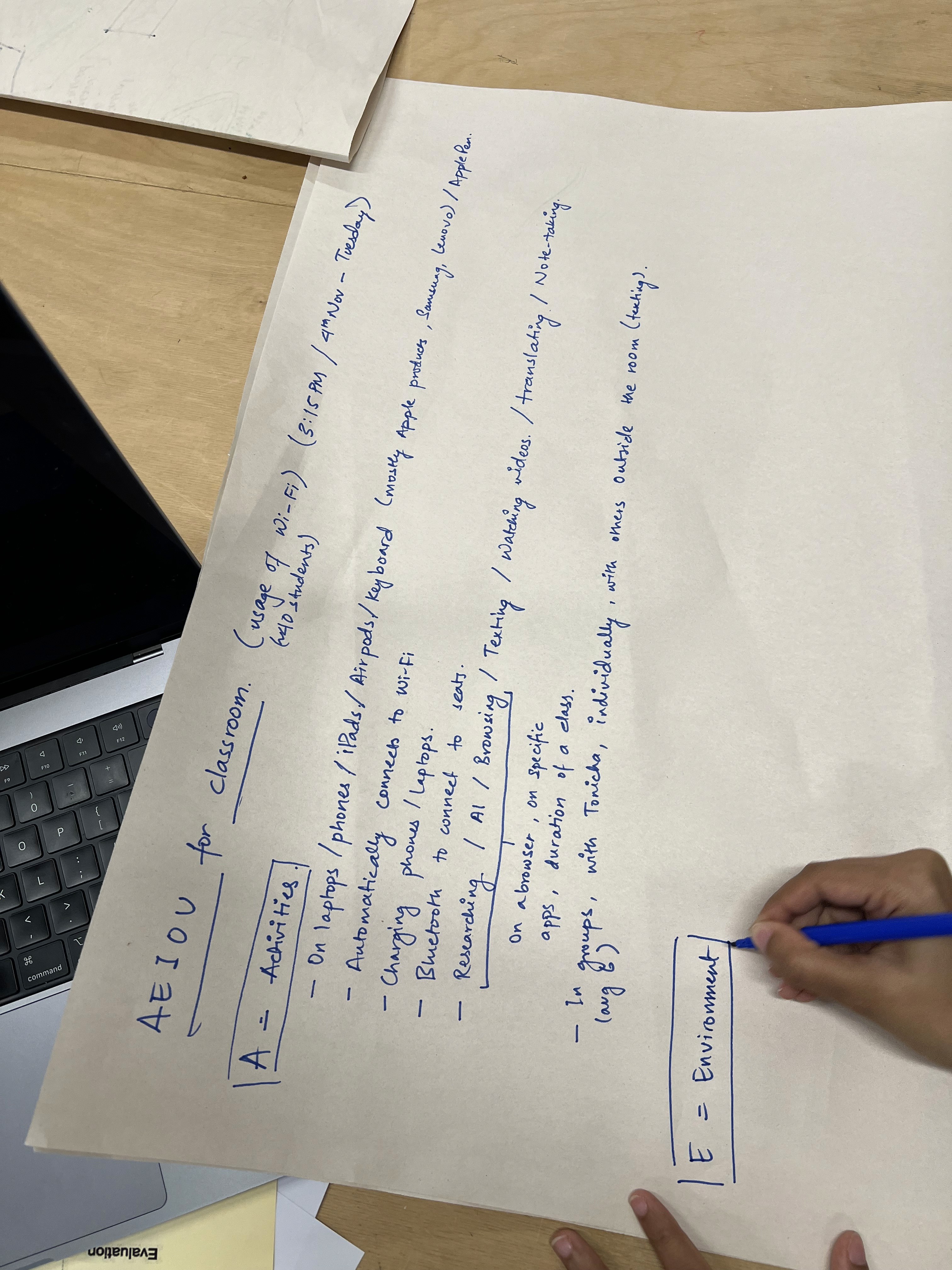 Based on the feedback, we conducted AEIOU to gain a better understanding of WiFi (a radio wave) in the class.